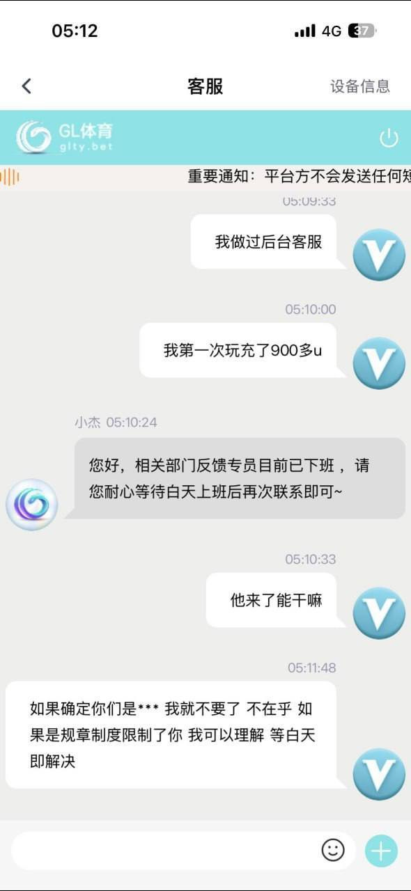 昨天有人在群里看到GL体育号称能玩人民币台子,心存侥幸冲了900U试水。玩了一会儿运气爆棚,赢了1000U,立马申请提款,结果平台直接卡死,说没绑定手机号码不给出款。